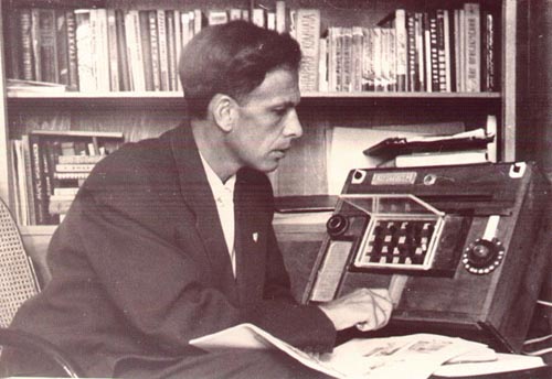 Генрих Альтшуллер за своей механической изобретательской машиной "Эвротрон".С сайта www.altshuller.ru :