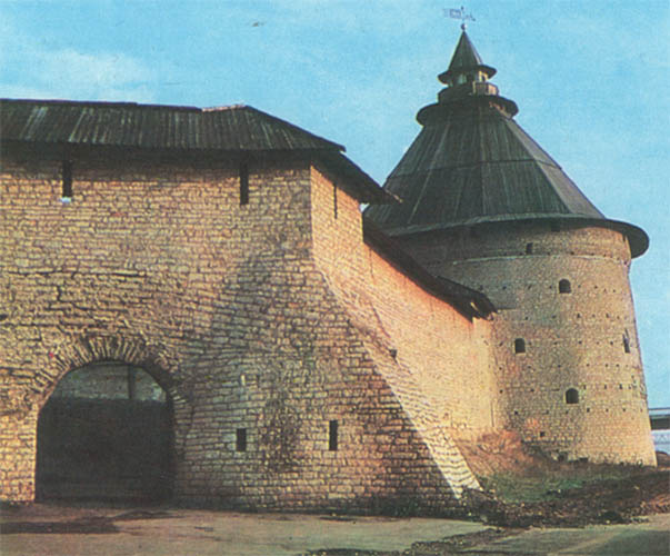 верху стен, и остроконечные шатры на башнях, и другие элементы,